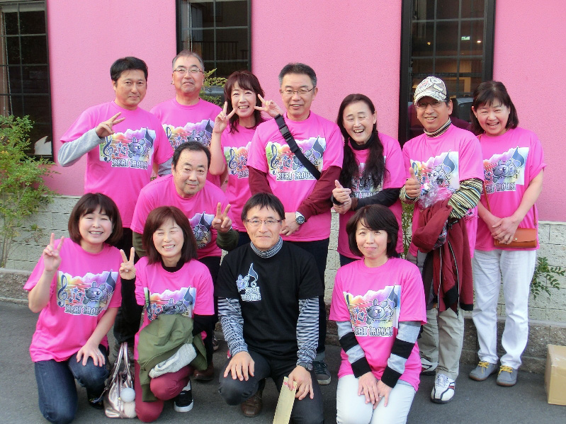 デザインは、同級生の絵の上手な人にお願いし、それをぷりんと工房オリジナルでロックバンドにふさわしいイメージを打ち合わせの際伝えて、とても素敵に仕上がりました!よい出来上がりだったので、同級生40人ほどで、応援Tシャツもつくりました。同じTシャツを着ることで、バンドと応援隊が一体化し、ライブ会場もきれいなピンクで盛り上がりました!大変満足しています。ありがとうございました。
